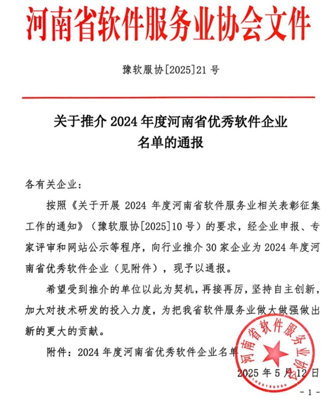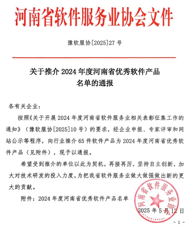 公司再度榮獲 2024 年河南省優(yōu)秀軟件企業(yè)及產(chǎn)品榮譽(yù)